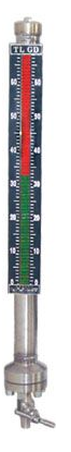 和被測(cè)容器形成連通器,保證被測(cè)量容器與測(cè)量管體間的液位相等。當(dāng)液位計(jì)測(cè)量管中的浮子隨被測(cè)液位變化時(shí),浮子中的磁性體與顯示條上顯示色標(biāo)中的磁性體作用,使其翻轉(zhuǎn),紅色表示有液,白色表示無(wú)液,以達(dá)到就地準(zhǔn)確顯示液位的目的。